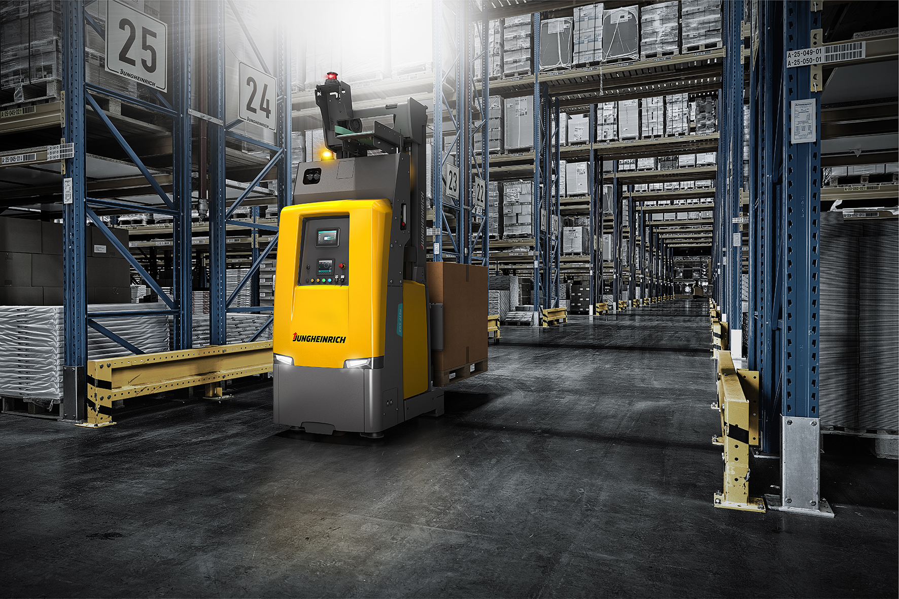 A Jungheinrich INNOVATION & HIGHLIGHTS 2021 virtuális sajtókonferenciáján mutatta be legújabb önvezető targoncáját, AGV-jét. Az új EKS 215a típusú önvezető targonca önállóan képes 700 kg tömegű rakomány betárolására egészen 6 méter magasságig.